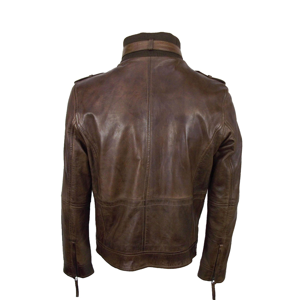 Mens Short Leather Short Coat 2 Side pockets. 3 Front top pockets. Double collar. Knitted collar. Collar belt.